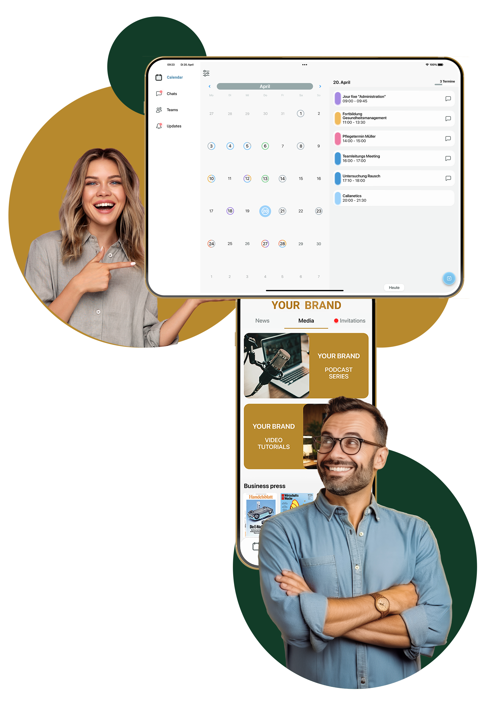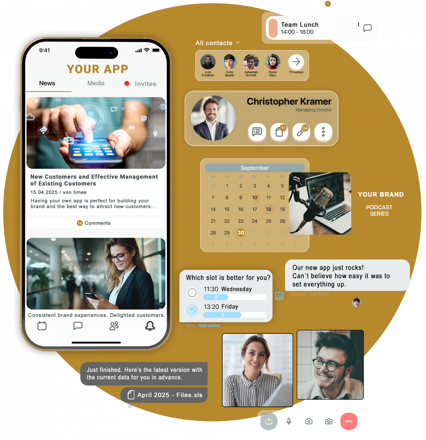 Your BrandApp combines all essential core features to organize your business – from calender and messenger, to file management and audio/video-Calls. Everything in one place, perfectly tailored to your brand.